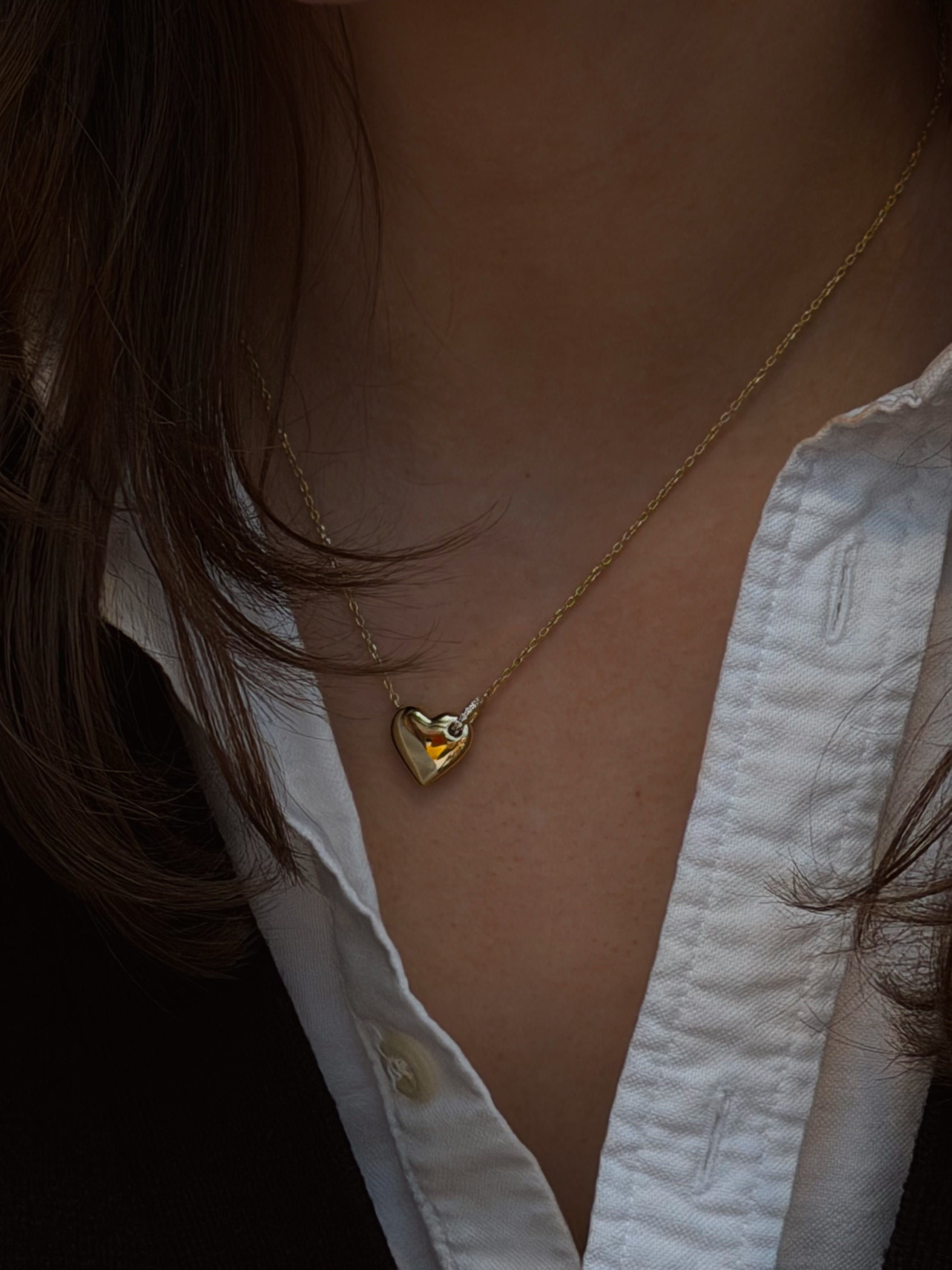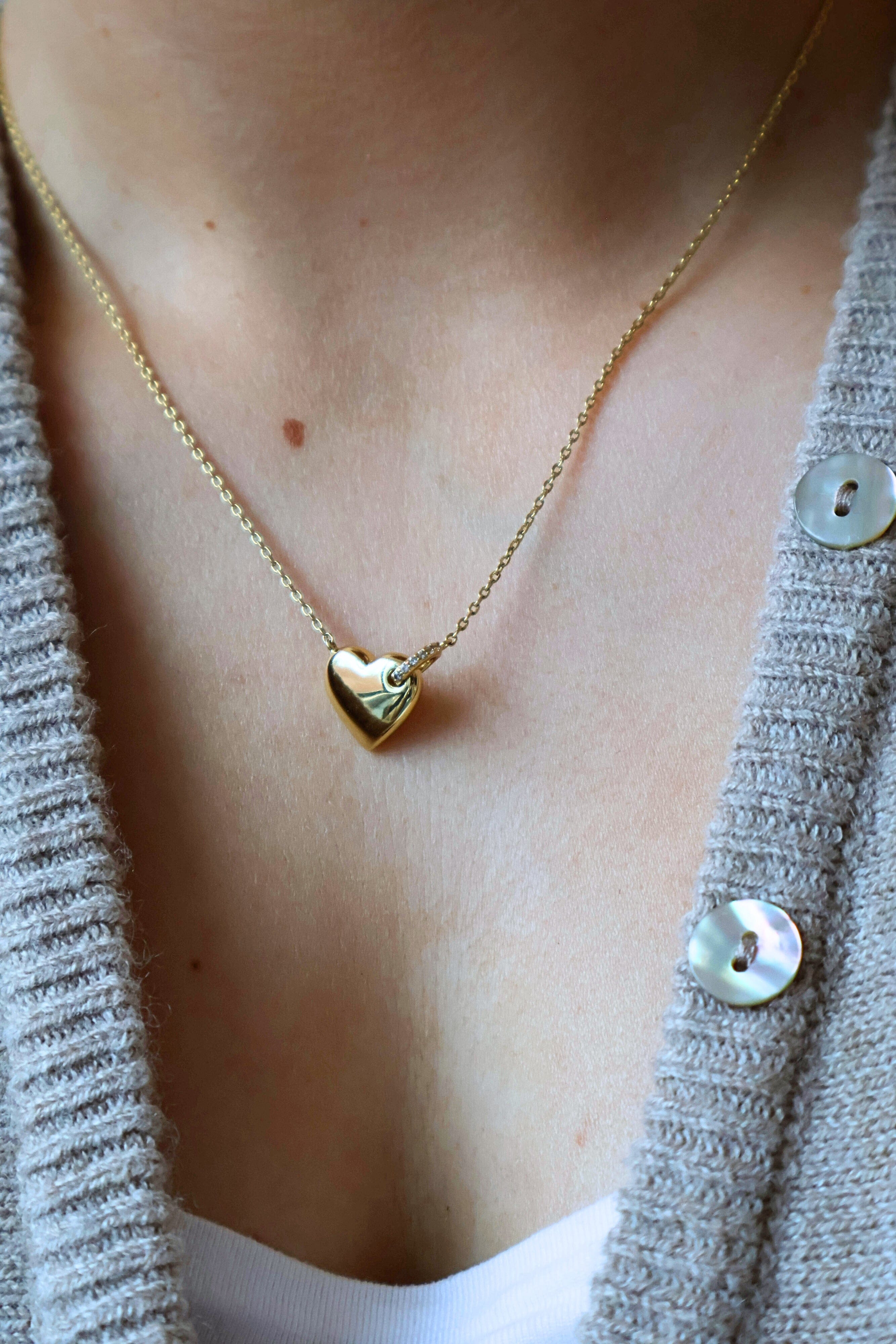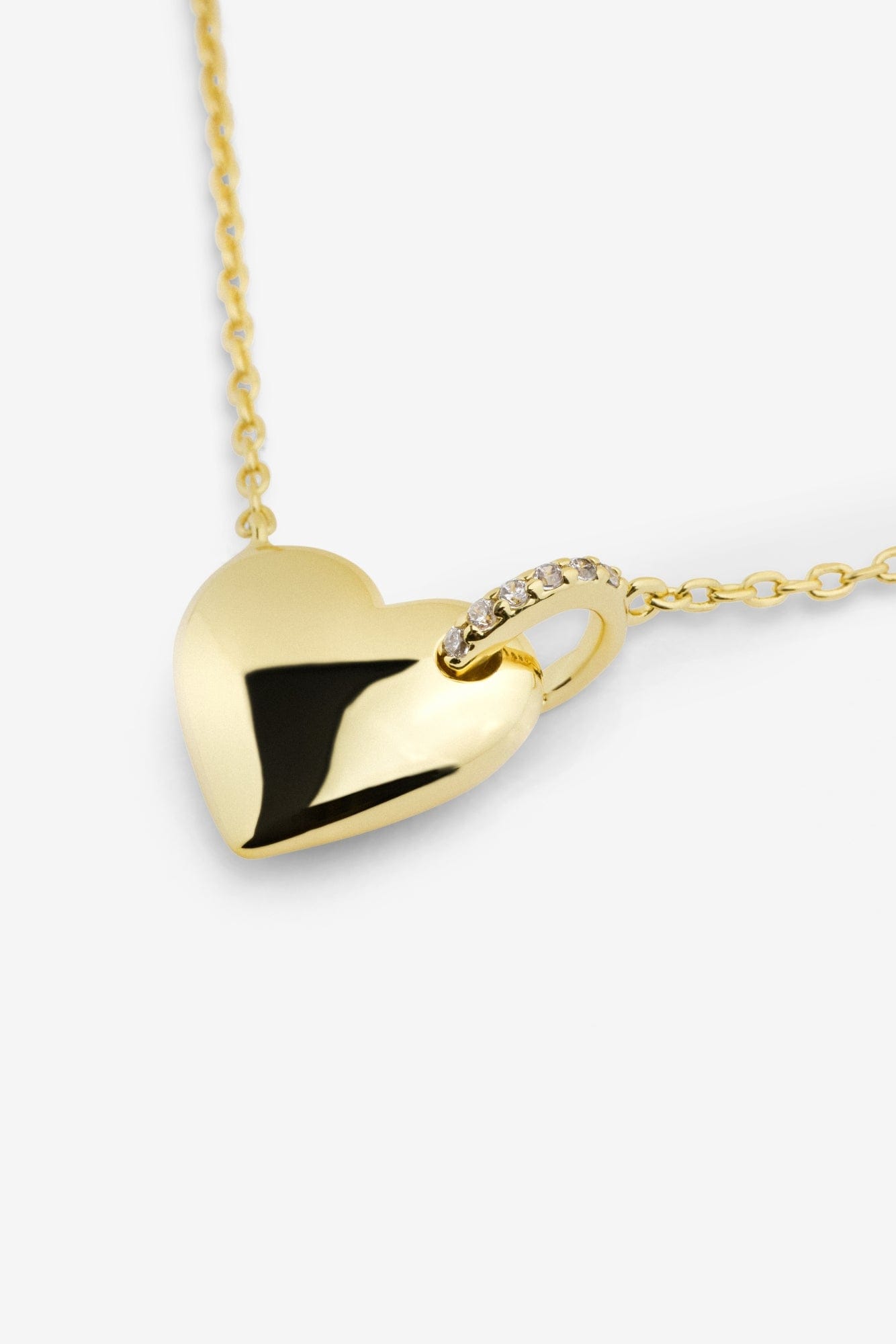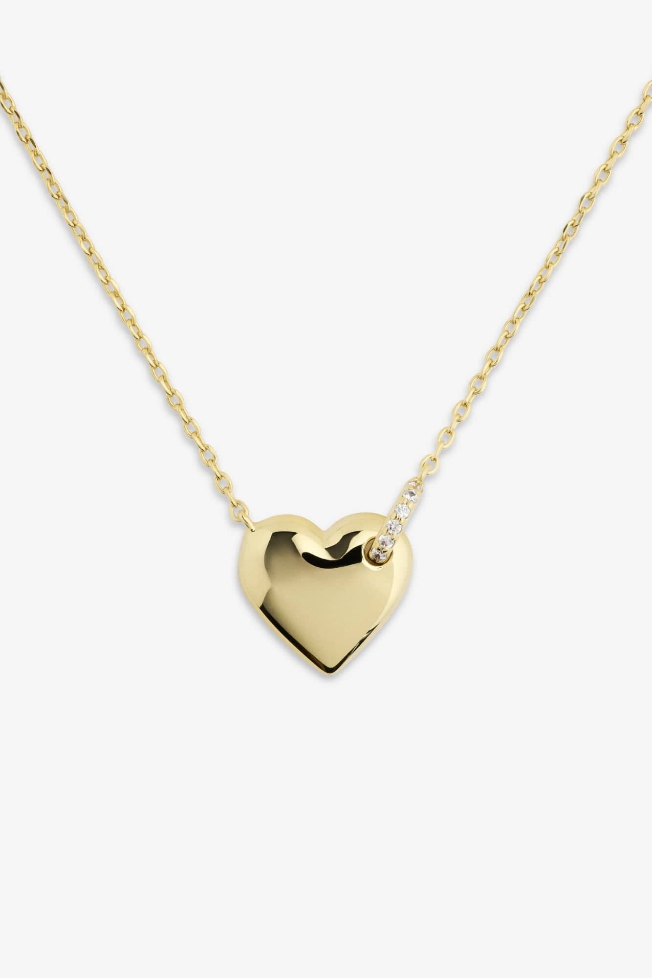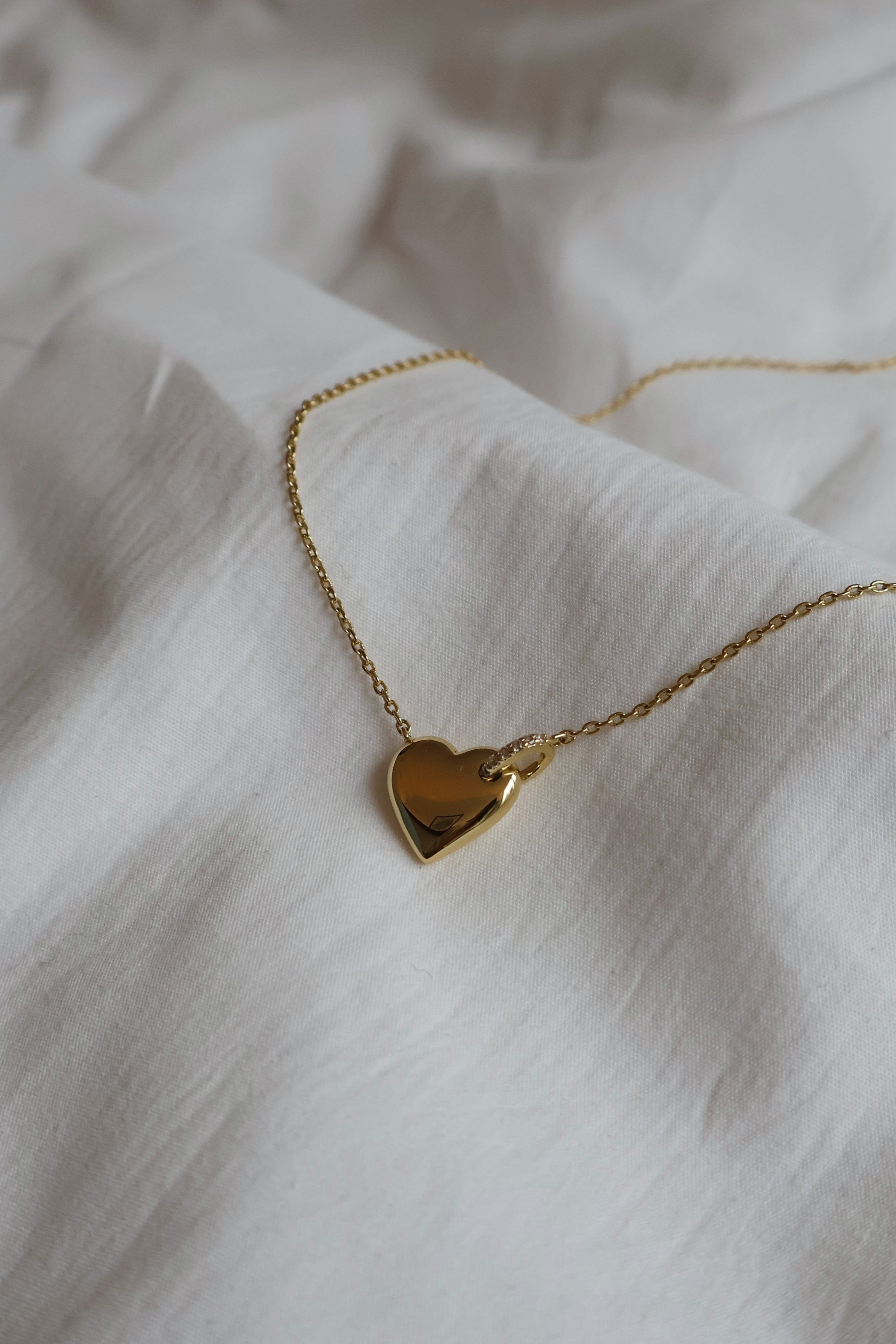 Bettina halskjede er et hjerteformet kjede pyntet med en ring av glitrende stener som gir smykket det lille ekstra. Bær det alene for et tidløst, feminint uttrykk, eller kombiner med andre gullkjeder for en komplett look.